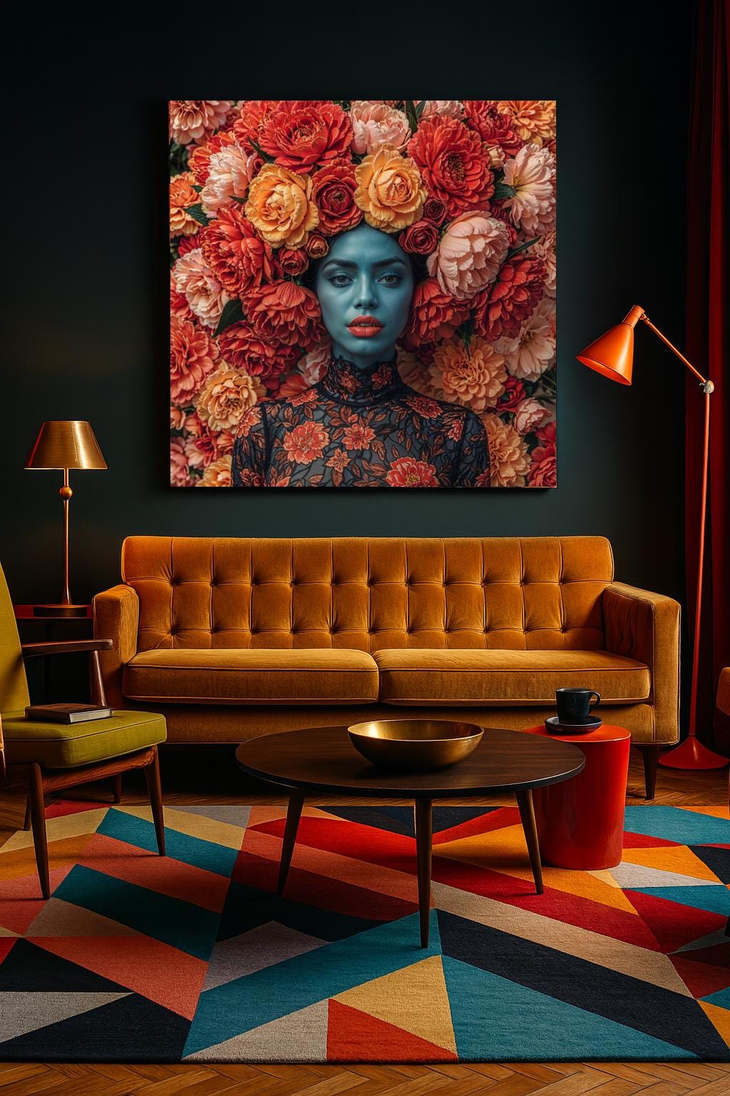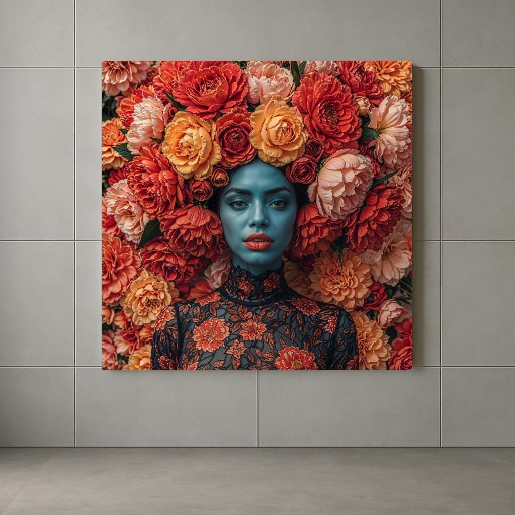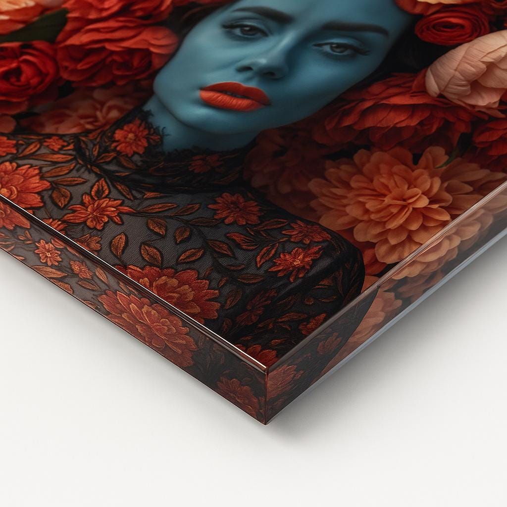 This electrifying artwork features a striking blue-painted woman crowned with voluminous peach and crimson blooms. Combining vibrant color theory, maximalist fashion, and dreamlike beauty, the piece is printed on museum-grade acrylic glass for a radiant and glossy finish.