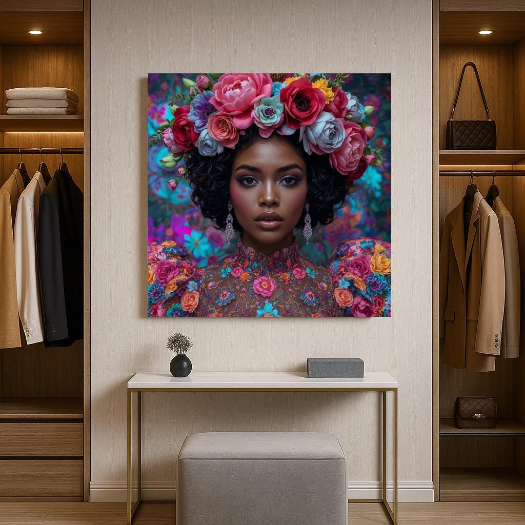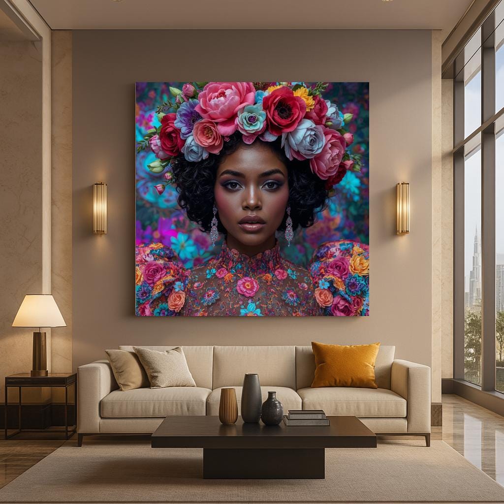 This vibrant artwork showcases a poised woman in couture florals, framed by an ornate crown of multicolored blooms in shades of pink, blue, and violet. Printed in luminous detail on acrylic glass, it captures the glamour and boldness of editorial fashion as timeless art.