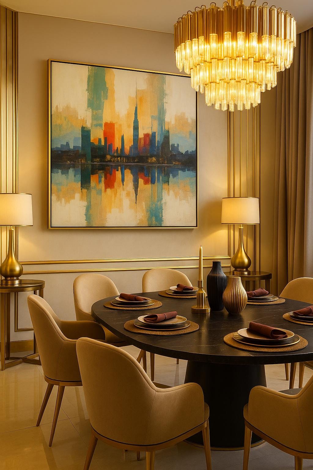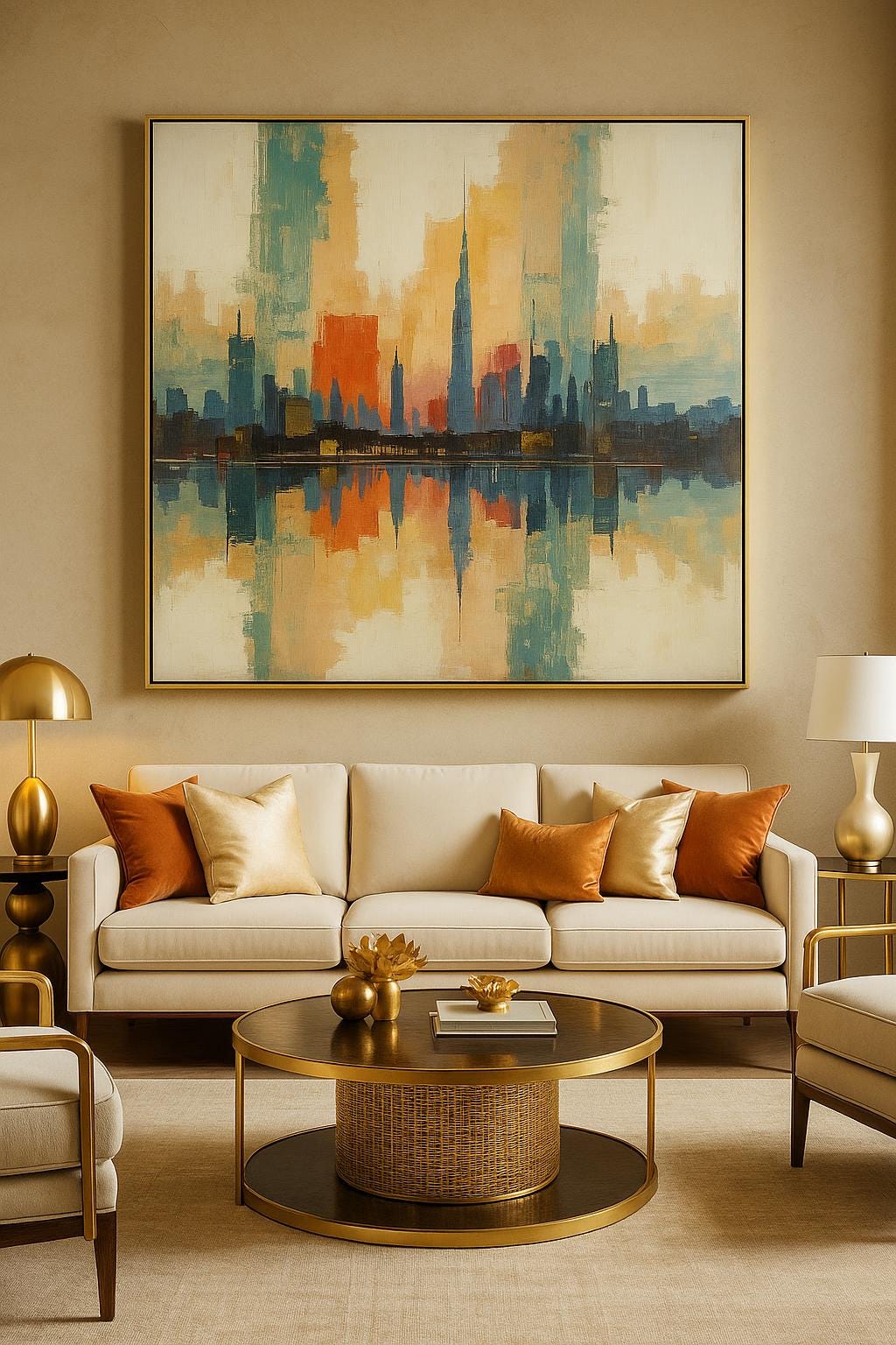 This Dubai skyline canvas art captures the city’s unmistakable architecture through textured abstraction and sunset-toned brushstrokes. Golden reflections and vertical energy merge to create a powerful cityscape — a tribute to Dubai’s rise as a modern icon of design and ambition.