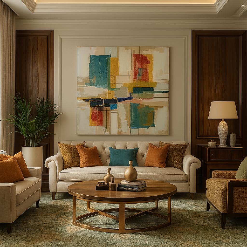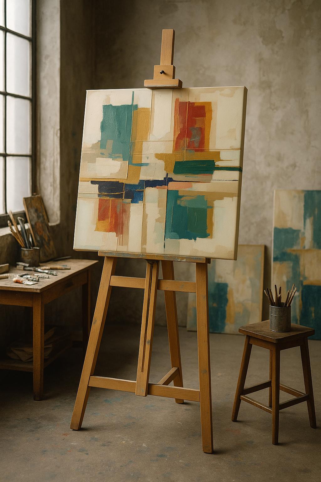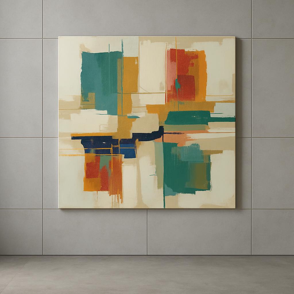Add balance and color with “Equilibrium,” an abstract framed canvas showcasing bold blocks of teal, ochre, and red in a striking, modern grid.