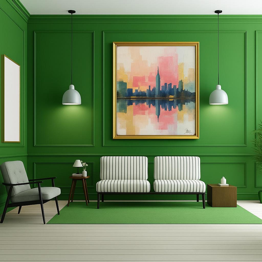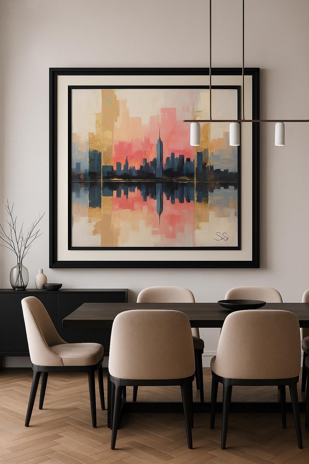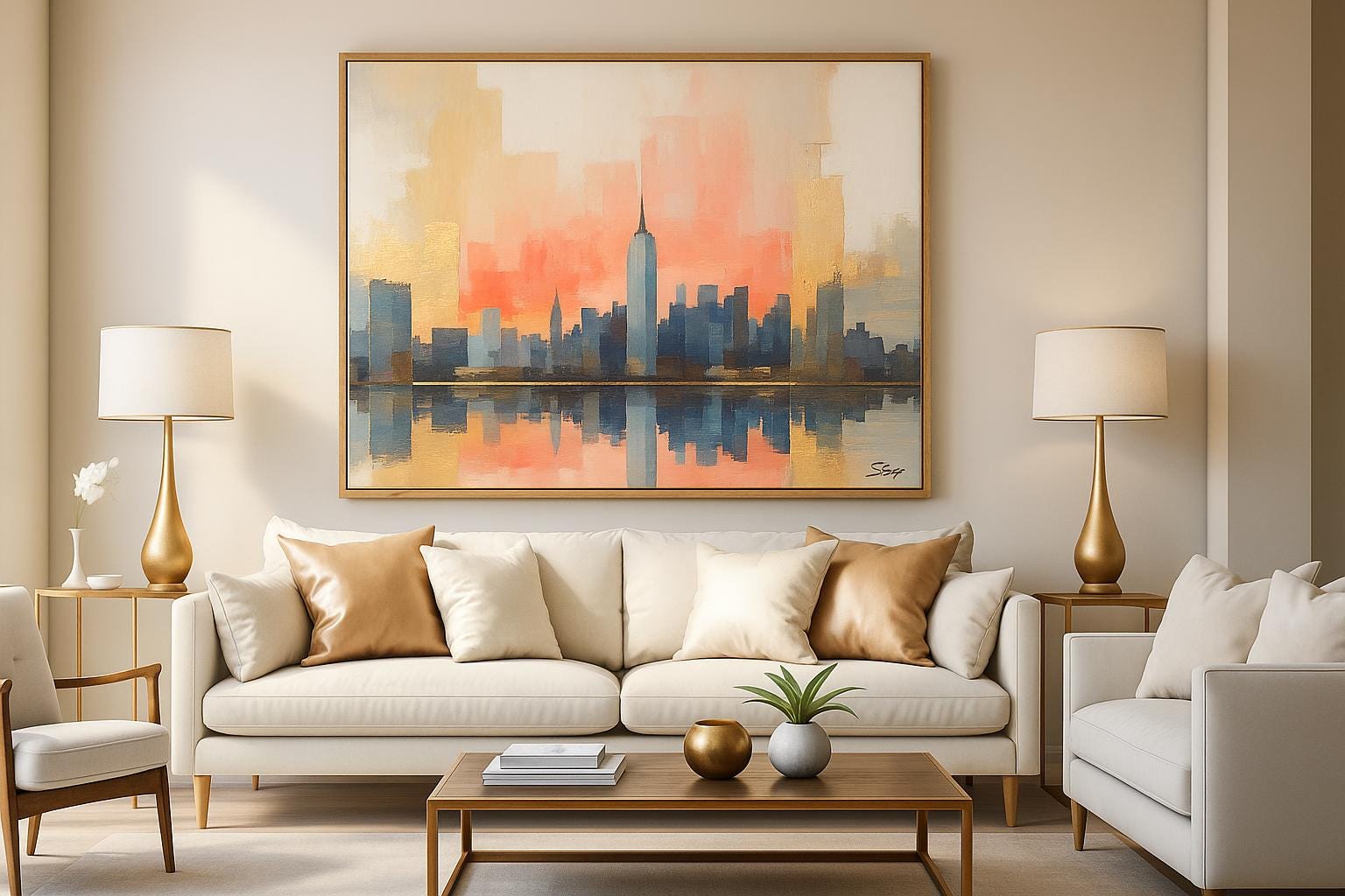This New York skyline canvas art captures the city’s silhouette in warm sunset tones, blending architectural lines with painterly texture. The reflection below creates an almost meditative balance, making it ideal for urban-inspired interiors and collectors of modern cityscape decor.