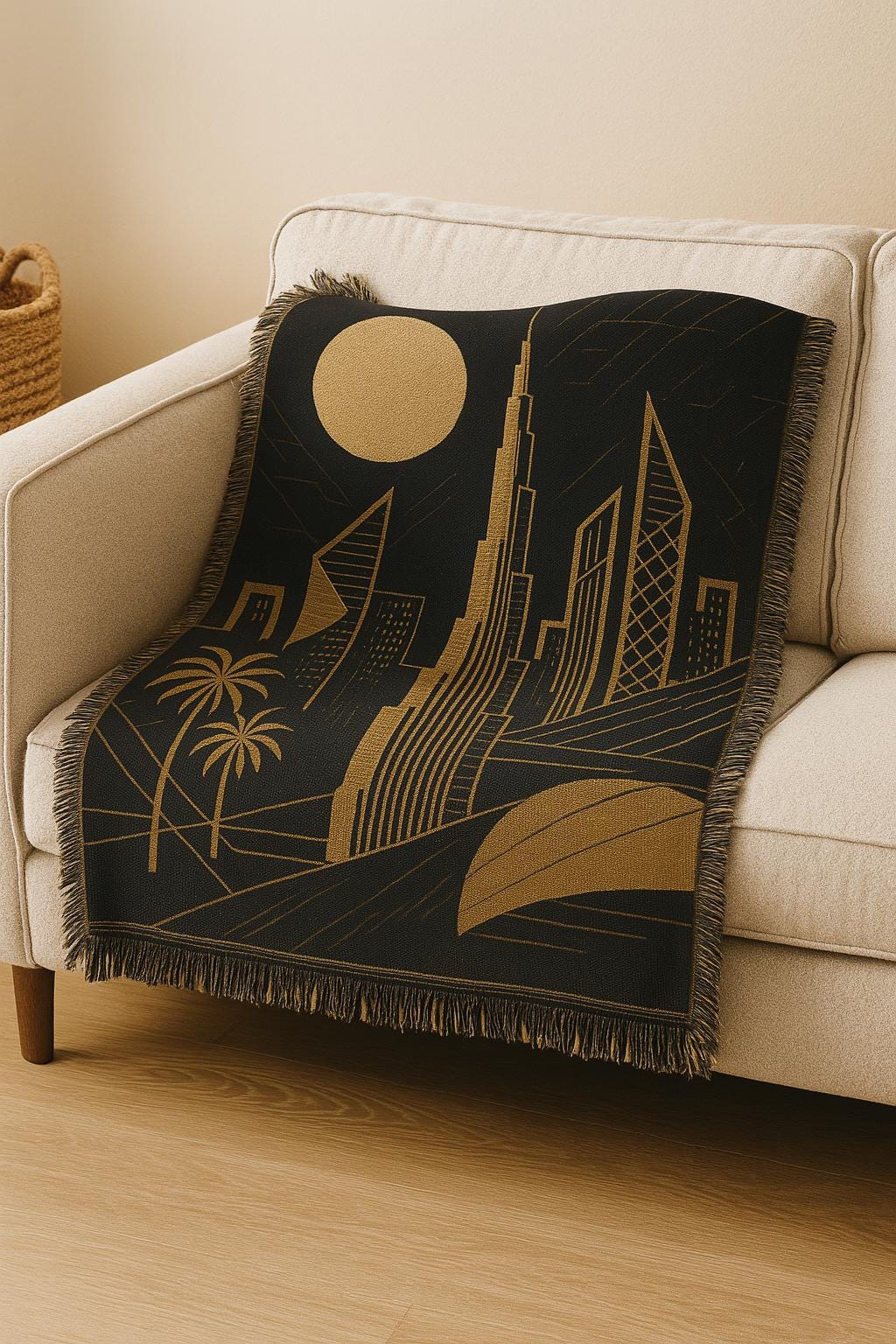 Dubai Skyline – woven cotton blanket designDubai Woven Blanket – Artistic Cotton Throw for Stylish Comfort